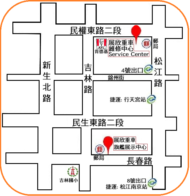 交通指南: 展欣重車旗艦展示中心 : 1. 捷運: 蘆洲線 松江南京站 (8號出口) 2. 汽車: 國道1號,松江交流道 3. 汽機車: 長春路與吉林路口 (長春路上) 4. 鄰近點: 中華郵政長春店隔壁。吉林國小斜對面。